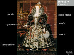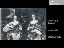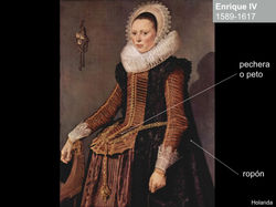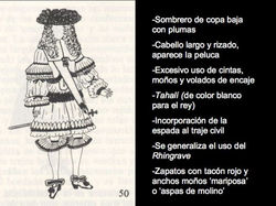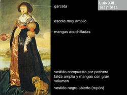 Se distingue por prendas que son muy amplias y muy ornamentadas, el uso de colores vivos brocados de seda y encajes. La ropa de las mujeres era más estilizada, en el área de la cadera la prenda iba más ajustada y se levantaba ligeramente la falda con aros de hierro, como parte de la vestimenta y de hecho una parte muy importante, también estaba el cabello, se recogía en distintas capas y se le daba forma con alambres mientras más alto y con más adornos era símbolo de mayor nivel social.